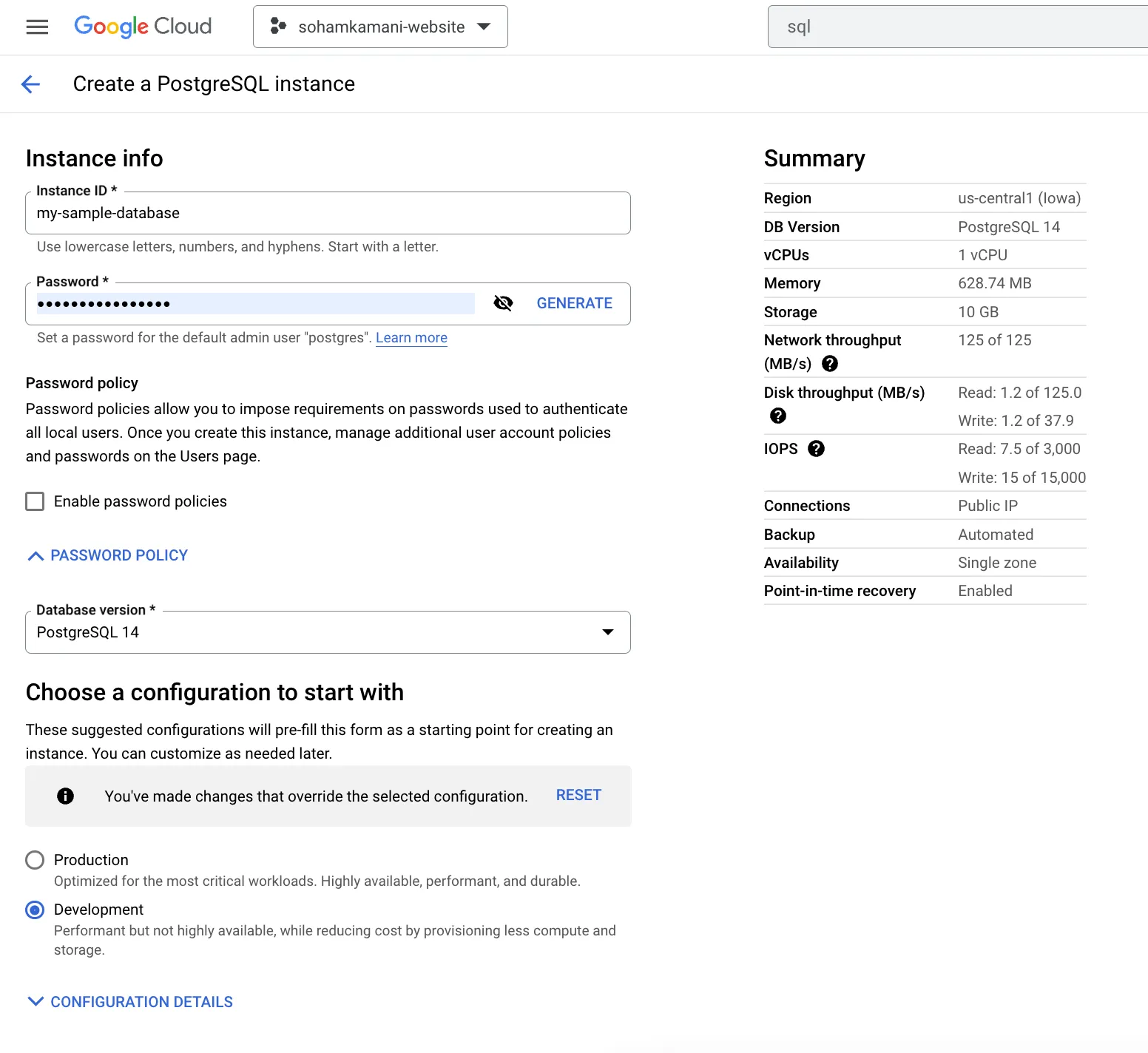 Next, you’ll need to configure the instance. This includes choosing the CPU, memory, and storage capacity according to your needs. You’ll be able to set a password in this page as well - which we will need to connect to the database later.